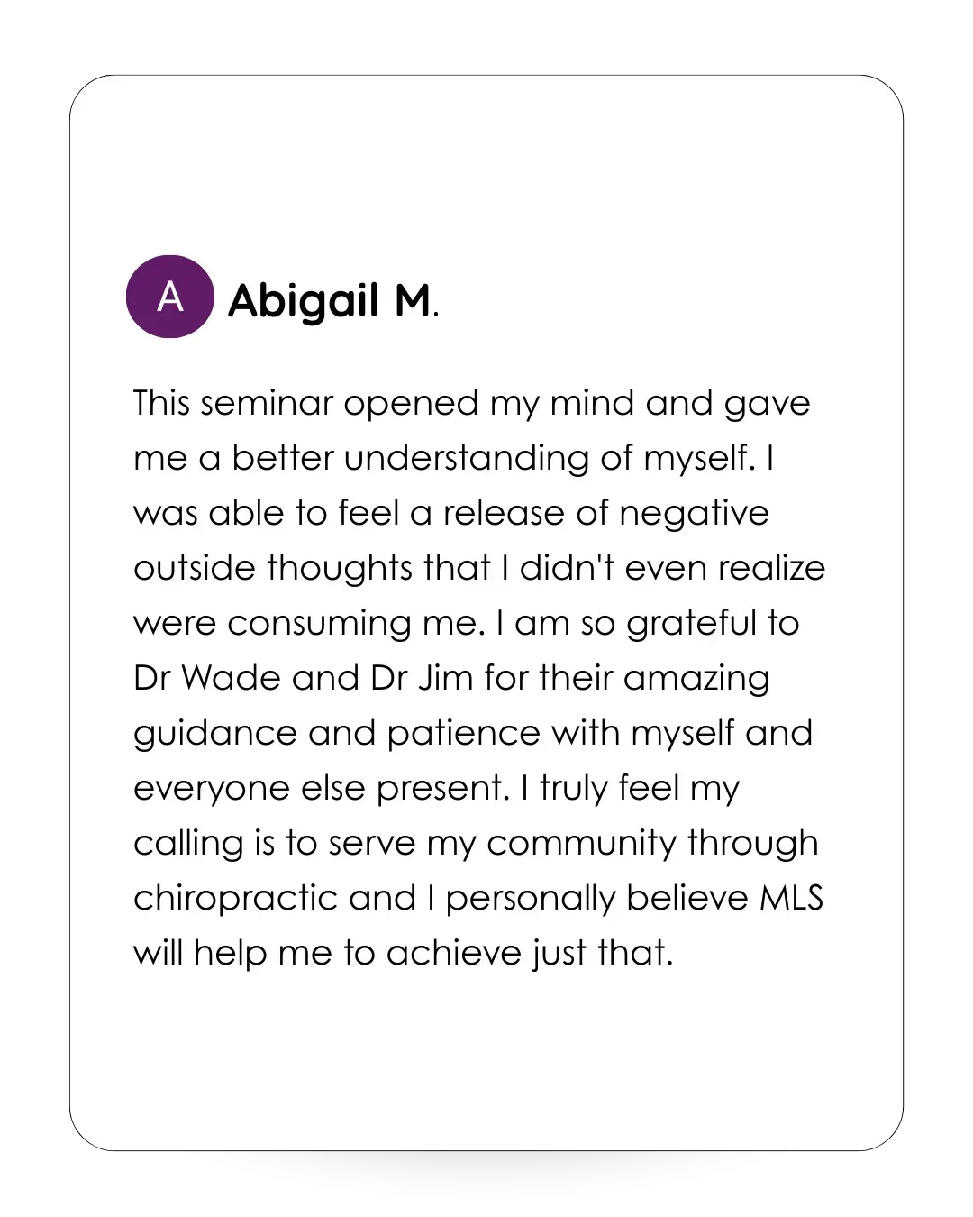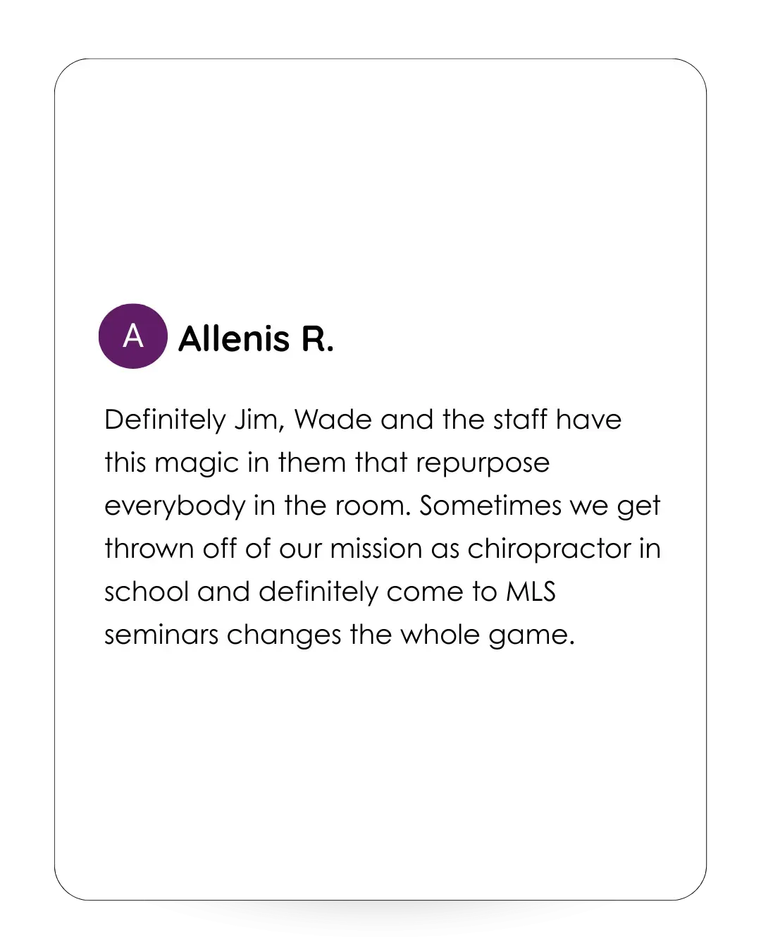 MLS is an educational and experiential community for chiropractors and teams who want to grow in mastery of care, love in connection, and service in practice. Our programs support both clinical excellence and personal embodiment.